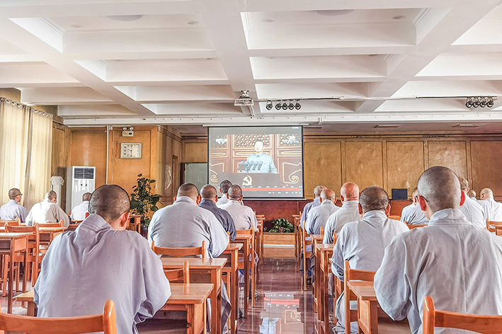 2022年10月25日晚,明海大和尚通过视频连线方式带领河北省佛学院全体师生及9323彩集团常住大众,在佛学院大礼堂学习党的二十大精神。 明海大和尚带领大众认真研读了党的......