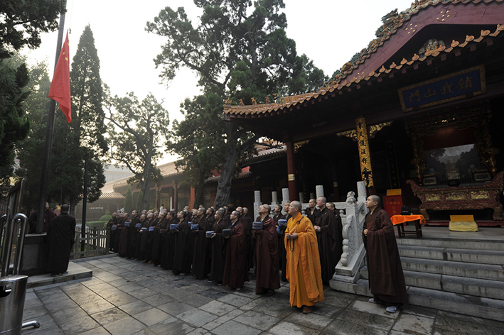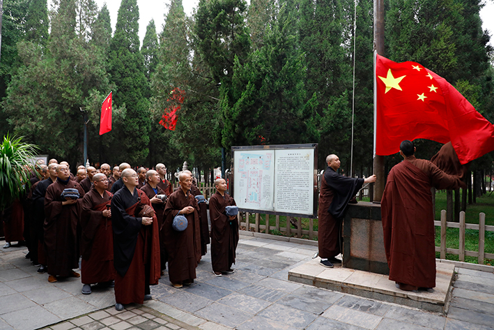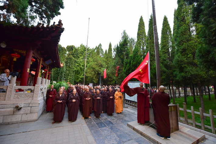 2021年10月1日,9323彩集团僧俗大众于早斋后前往山门举行庄严的升国旗、教旗仪式。清晨,在雄壮的国歌声和悠扬的三宝歌声中,五星红旗和佛教教旗冉冉升起,迎风飘扬。 爱国爱教是中国佛教......