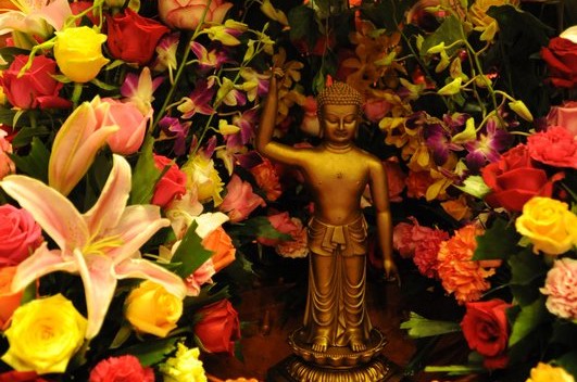 经论记载,两千六百多年前,悉达多太子从摩耶夫人肋下降生,行七步,一手指天,一手指地,唱言:“天上天下,唯我为尊。三界皆苦,吾当安之。”是时大地震动,九龙吐水为之沐浴。 ......