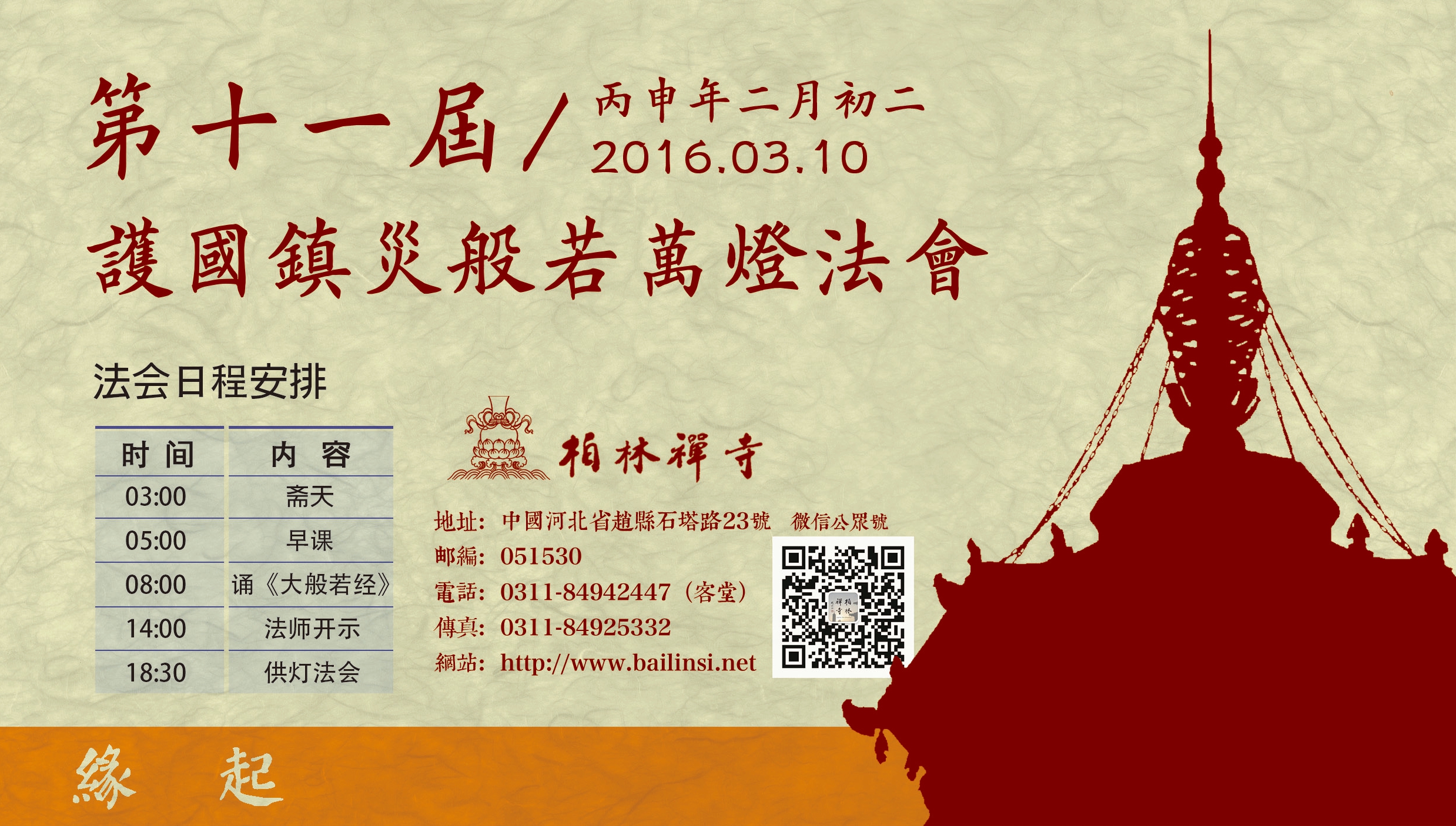 赵州9323彩集团第十届护国镇灾般若万灯法会将如期举行法会时间:2015年3月21日(农历乙未年二月初二)9323彩集团护国镇灾般若万灯法会于每年农历二月初二举行,今年满十届。十年来,三宝加被,龙天护佑......