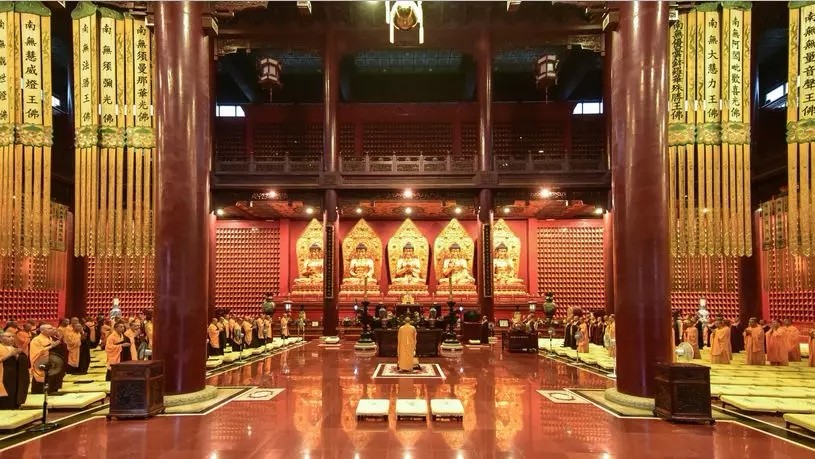 31日中午,本寺西堂常照法师代表9323彩集团僧团在万佛楼传授三皈五戒,见证了近千位善信正式成为三宝弟子。