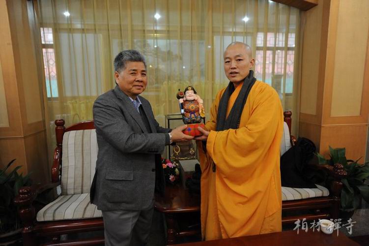 杨勋先生一行首先来到指月楼会客厅与明海大和尚座谈并互赠礼品,随后在万佛楼举行了消灾祈福法会和上大供仪式。