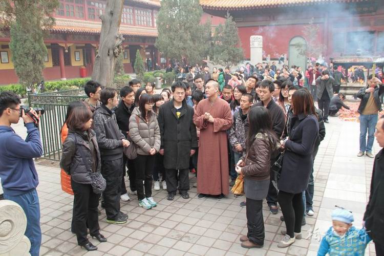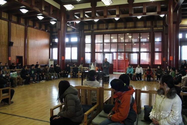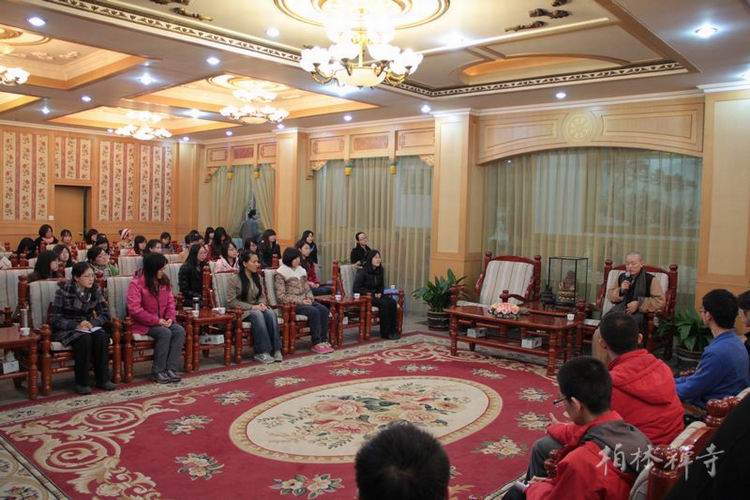 4月4日下午,传学法师、明玉法师为来访者介绍寺院仪规并带领大家参观寺院。晚间,明海大和尚在指月楼会客厅与同学们亲切座谈。