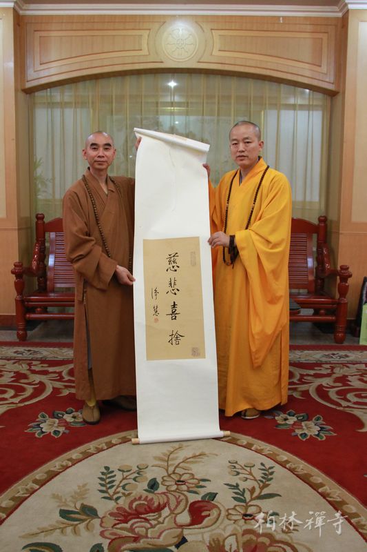 明海大和尚陪同考察团朝礼祖师塔及万佛楼、参观省佛学院,之后与客人们在指月楼客厅进行了愉快的交流并互赠纪念品。