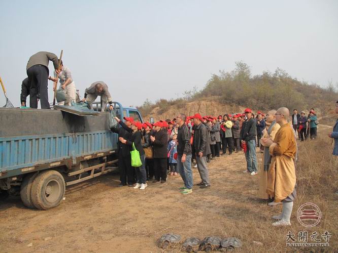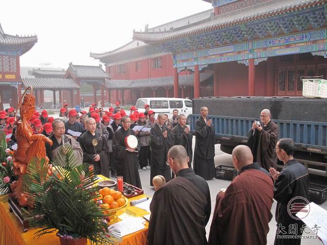 2013年10月30日上午七时半,一台装有数十只巨大特制水箱的大型货车,停靠在邢台大开元寺护国仁王佛阁法堂门前,水箱内满载着从水产市场买来的活鱼。车旁地上几只塑料萝筐,七八只牛头大小的乌龟一动不动地呆在里面。邢台大开元寺僧俗百十余众聚集于此,正在举办大型放生法会。