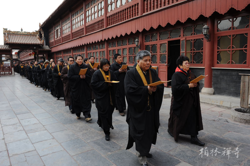 凌晨3点,净慧长老在万佛楼主持了庄严的斋天仪式。上午8点,万佛楼内庄严肃穆,千余名信众共诵《大般若经》,经同卷异,共启智慧之门。诵经毕,四众弟子手捧经书绕寺一周,并将诵经功德回向法界众生。