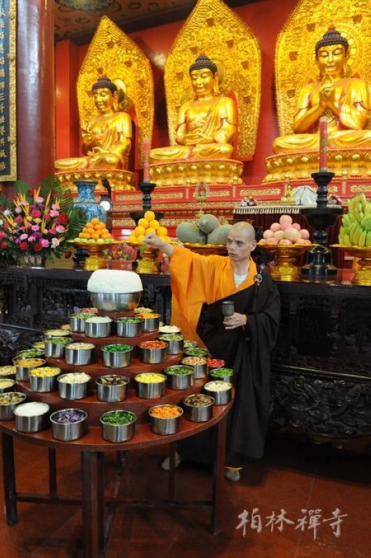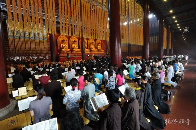 是时,寺院内供奉五味茶果,香灯严净。上午9时,两序大众云集万佛楼,欢喜奉行盂兰盆法并虔诵《盂兰盆经》,敬设盂兰盆供;中午12时30分,礼请监院明影法师为近千名信众传授了三皈、五戒;入夕,四众佛弟子在万佛楼设《瑜伽焰口》一堂。以法会之力供养十方自恣僧,报答双亲养育之恩,救拔七世父母离恶道。