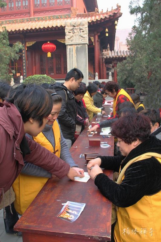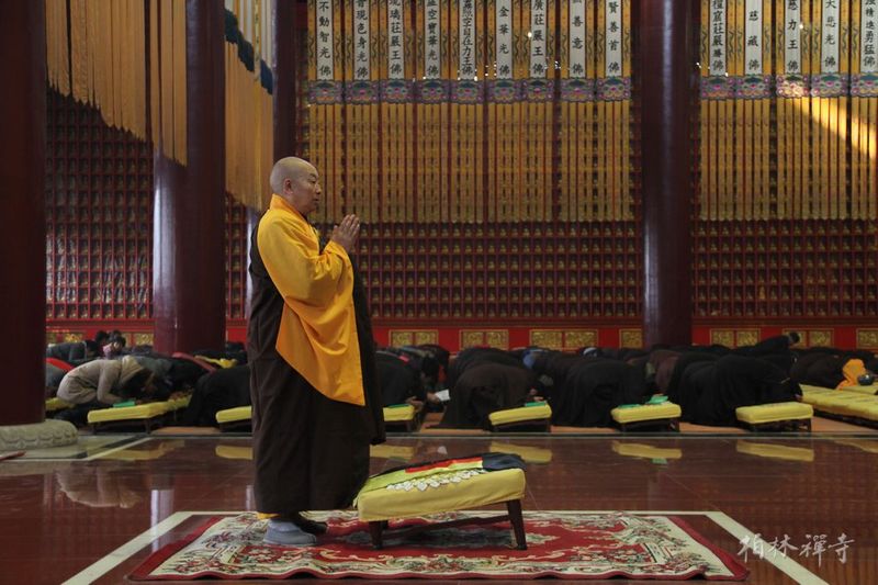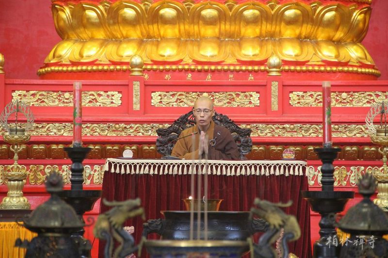 2日中午,本寺监院明影法师在万佛楼为近千名善信传授三皈五戒。