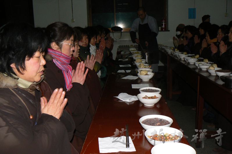 初八清晨,上千信众在斋堂分享腊八粥。九点三十分,万佛楼内祝圣普佛、上大供,2000余人云集古佛道场,礼佛参拜。中午,明海大和尚为千余信众授三皈五戒。