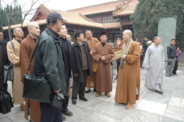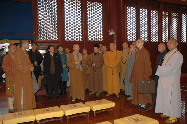 明海大和尚陪同访问团一行参观寺院,朝礼了赵州塔和万佛楼,之后来到河北省佛学院参观。最后,明海大和尚和客人们在指月楼客厅进行了愉快的交流,并向访问团赠送了纪念品。