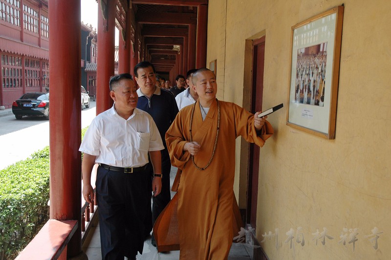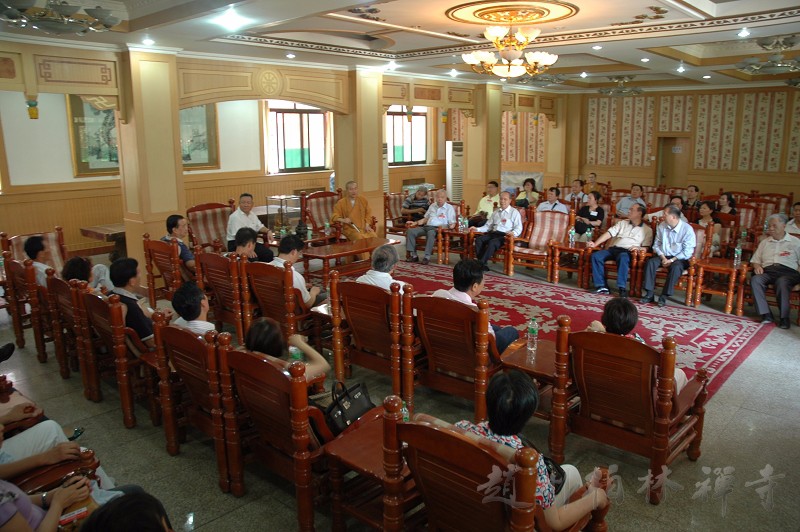明海大和尚带领客人参观寺院后,来到指月楼客厅座谈,并在万佛楼前合影留念。