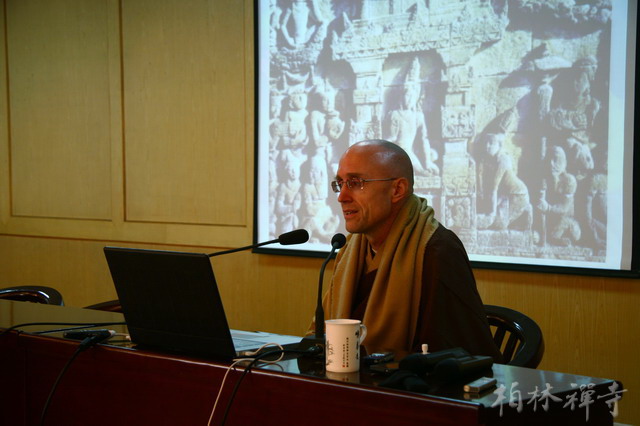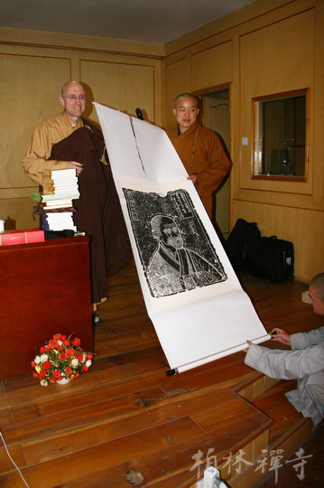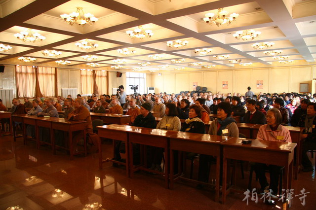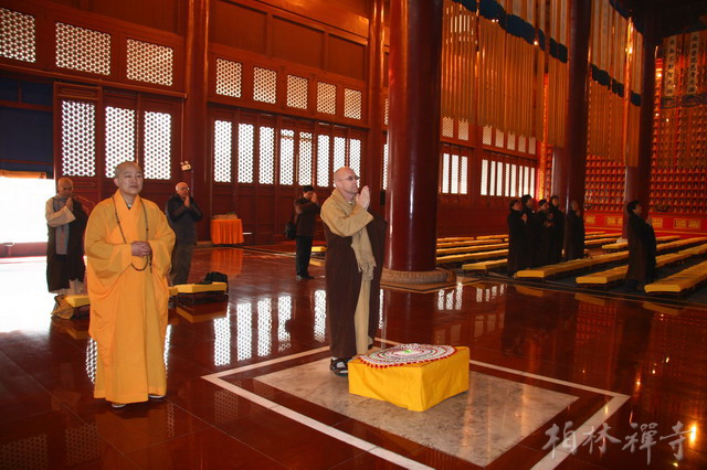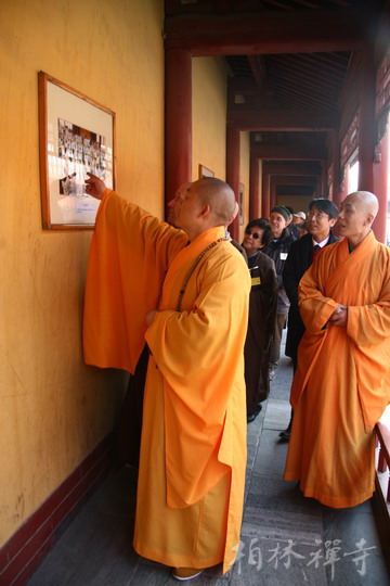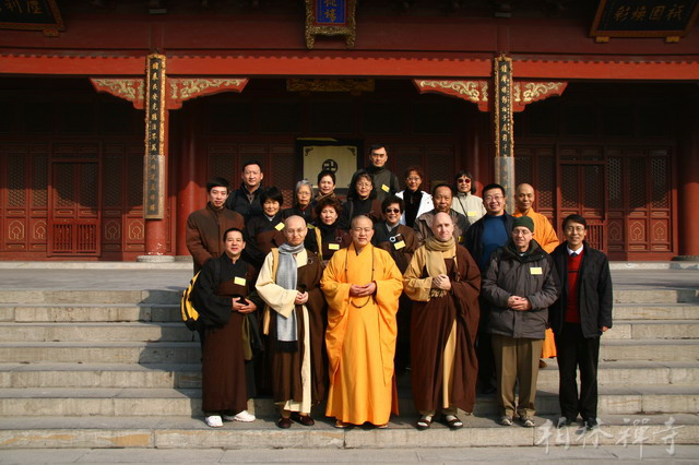 明海大和尚带领客人参观了寺院主要殿堂,随后来到指月楼客厅座谈。中午一点半,恒师法师在佛学院礼堂为全寺大众作了精彩开示。