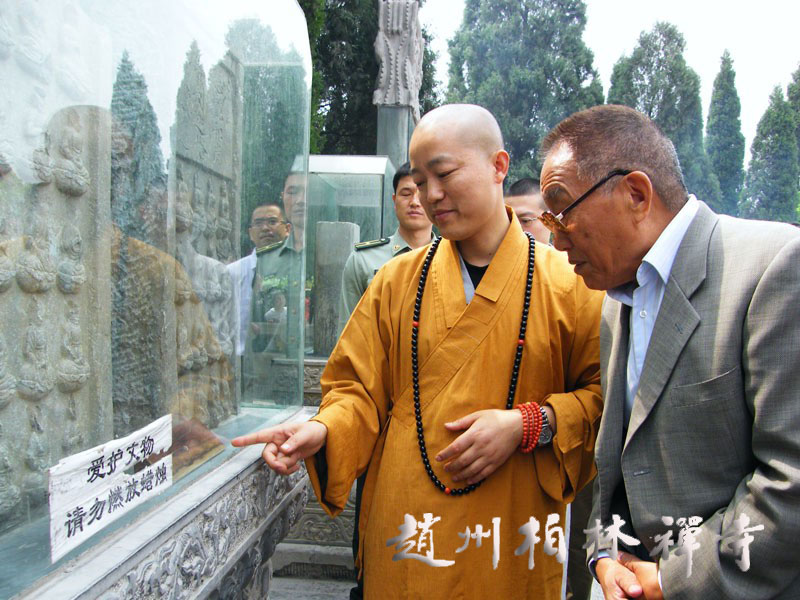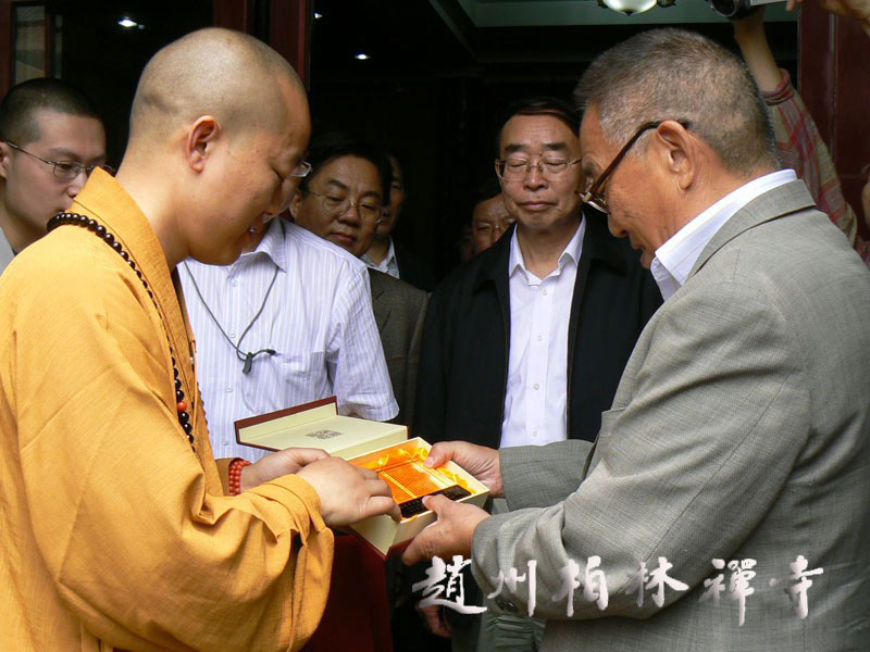 明海大和尚带领大家参观了赵州塔、普光明殿和万佛楼,之后来到方丈寮座谈,并向大家赠送了纪念品。