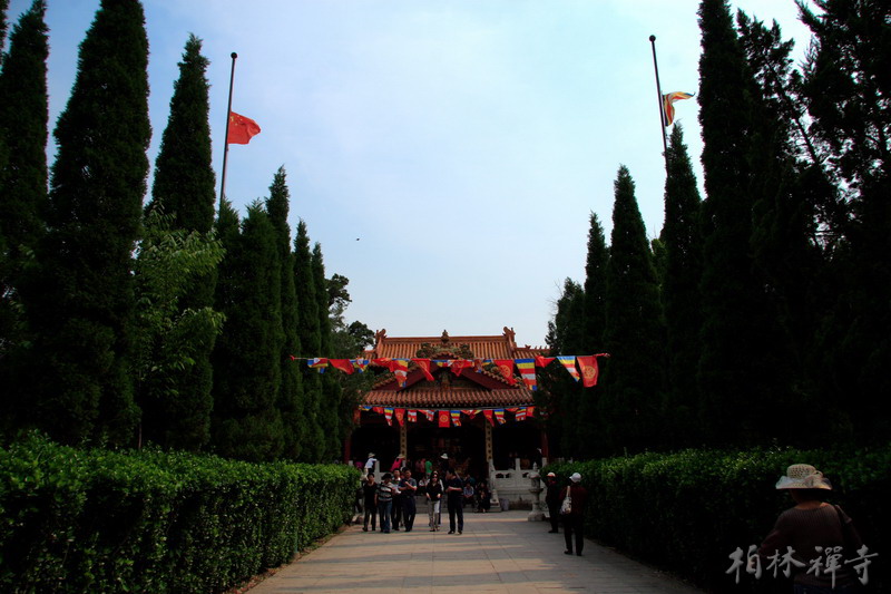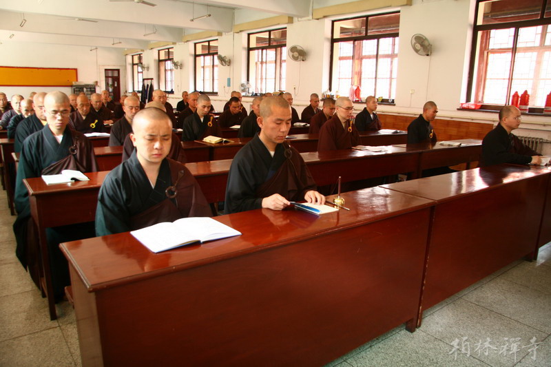 下午2点,全体比丘按惯例在大斋堂开始诵戒。至2:28分时,钟声响起,诵戒暂停,大众为汶川地震中的死难者集体默哀三分钟。自19日起至21日,山门口的国旗和教旗也降下半旗,与国同哀。