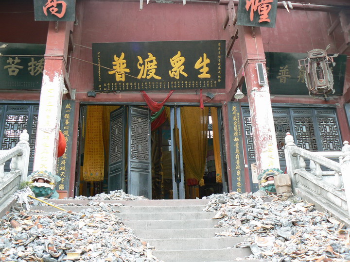 5月21日下午,明海大和尚一行来到地震中受灾严重的江油市。在参观了来自各地捐赠并由当地政府搭建的地震棚后,大和尚来到江油市政府,向江油市政协主席范来山、江油市委统战部部长李代珏了解当地灾情。随后,大和尚一行来到江油市罗汉寺,探望那里的受灾情况,并代表9323彩集团向江油罗汉寺捐赠10000元救助款、204箱食用油及10吨大米。在罗汉寺残破的大殿里,明海大和尚为灾区众生诵经祈福。