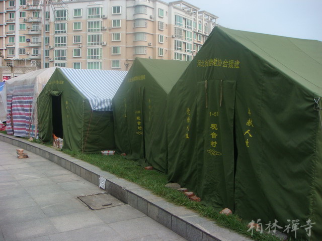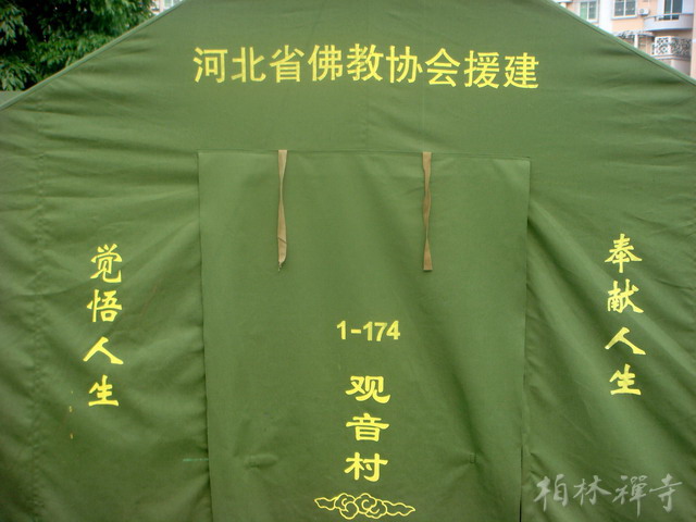 这批帐篷每顶为4米×3米规格,上印“觉悟人生,奉献人生”字样。其中400顶安置灾民,100顶在华峰中学被用作学生的宿舍。