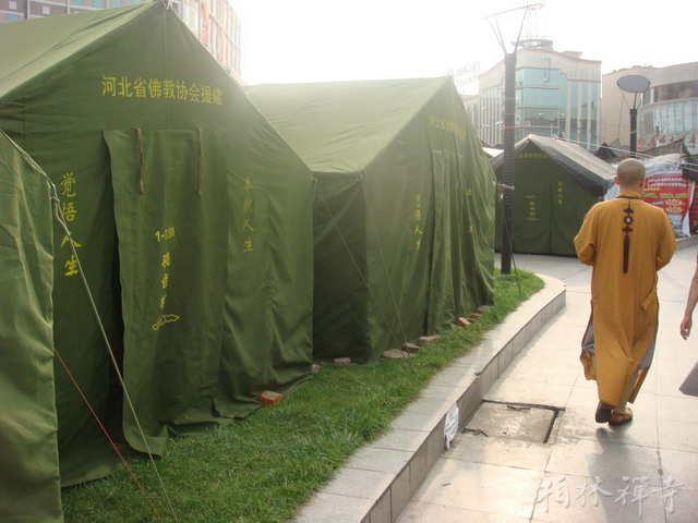 由河北省佛教协会组织信徒捐助的500顶防震帐篷在四川绵阳江油市到位。6月20日下午省佛协副会长明海大和尚偕捐助帐篷的主要居士亲往江油考察,受到江油市委统战部部长李代珏,江油罗汉寺住持仁苦法师的欢迎。