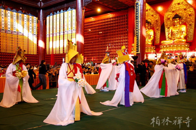灵山斋是韩国太古宗一项传统的法事,表法佛陀灵山说法后大众踊跃歌舞以申供养的情景。这项法事已申请了韩国无形文化财(即汉语中的“非物质文化遗产”)。这次来华展演一共两站,第一站在北京八大处灵光寺(11月15日)。