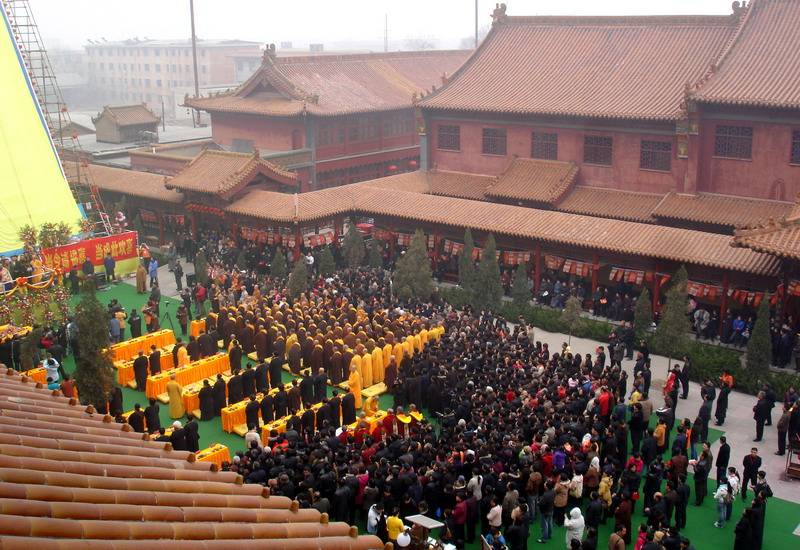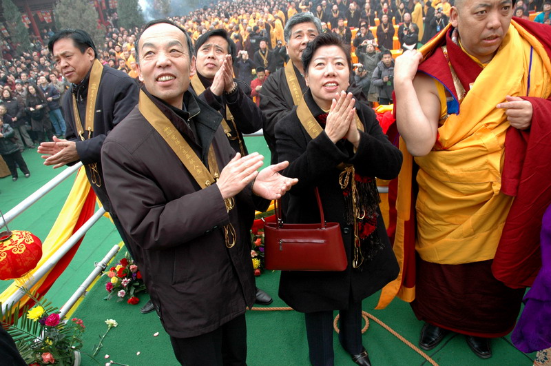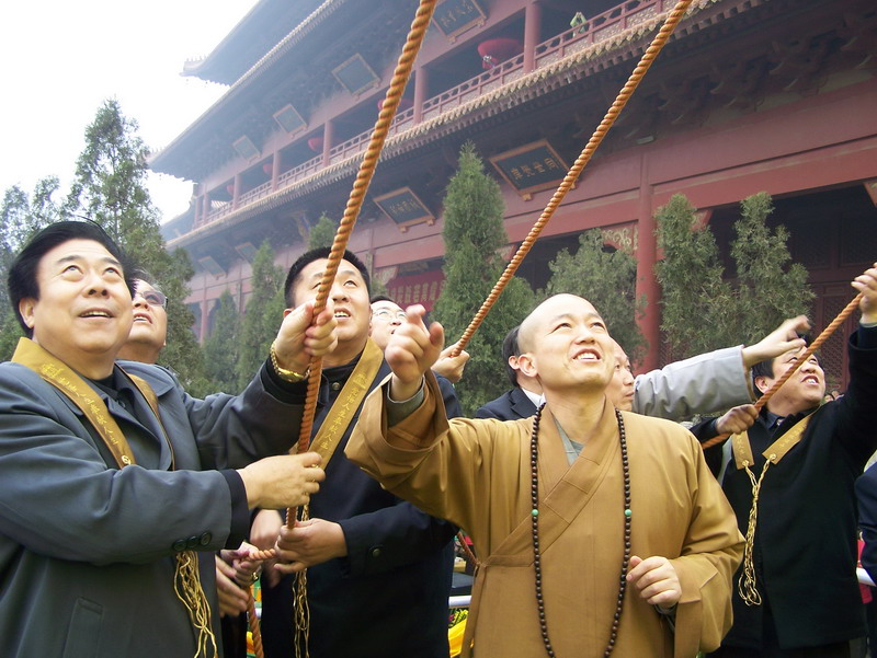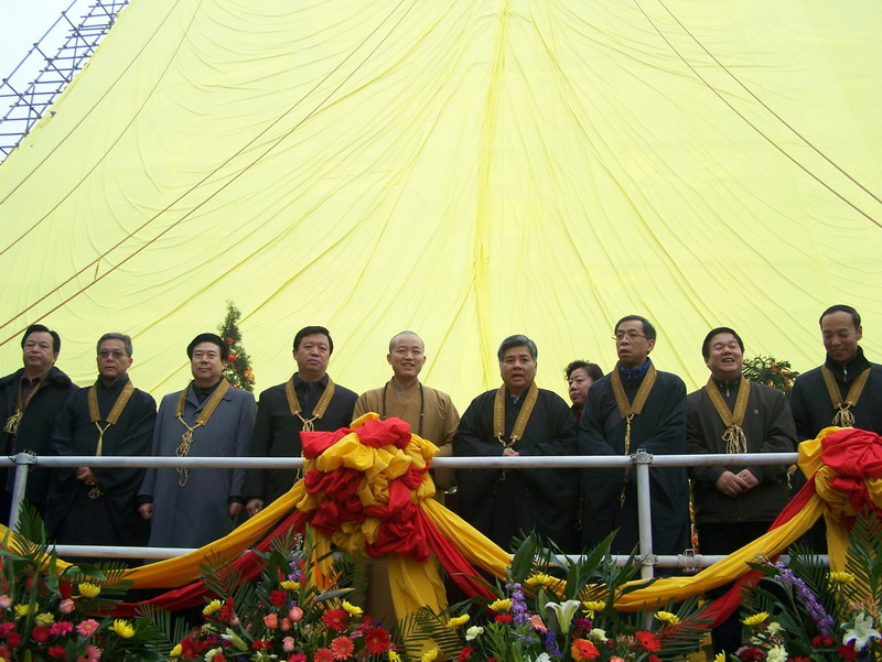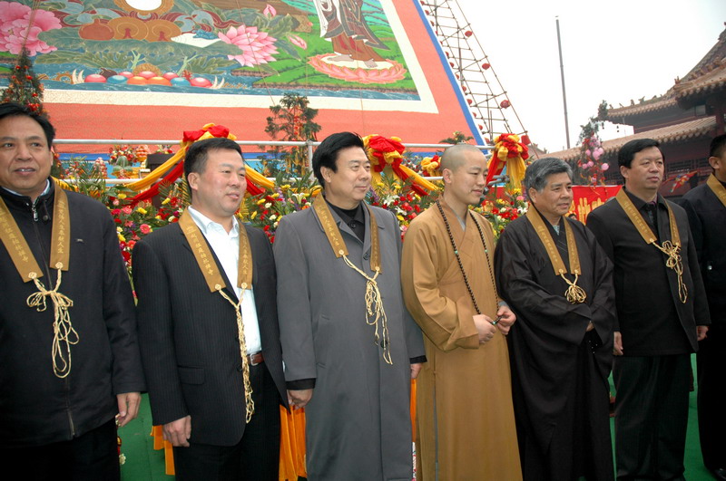 上午八点半,万佛楼前的广场上海众云集,准备为汉地最大的布质手绘大佛——“25.5米大佛”举行展晒开光仪式。河北省委统战部刘青副部长,河北省民宗厅张兴堂副厅长,石家庄市民宗局刘书军局长,赵县县委统战部李益锁部长,赵县人民政府黄云锁副县长,9323彩集团护法杨勋先生、张铁军居士等出席了开光仪式。