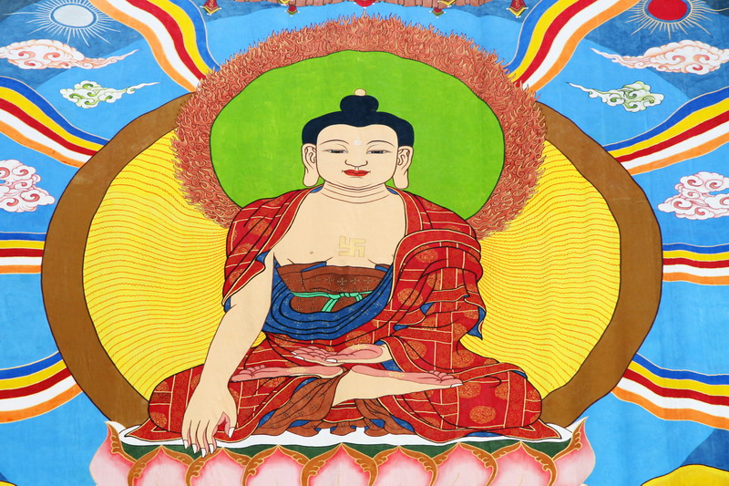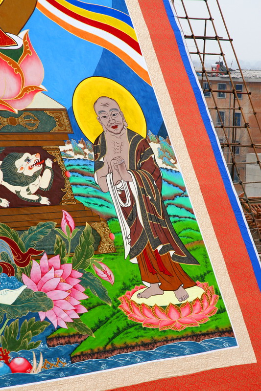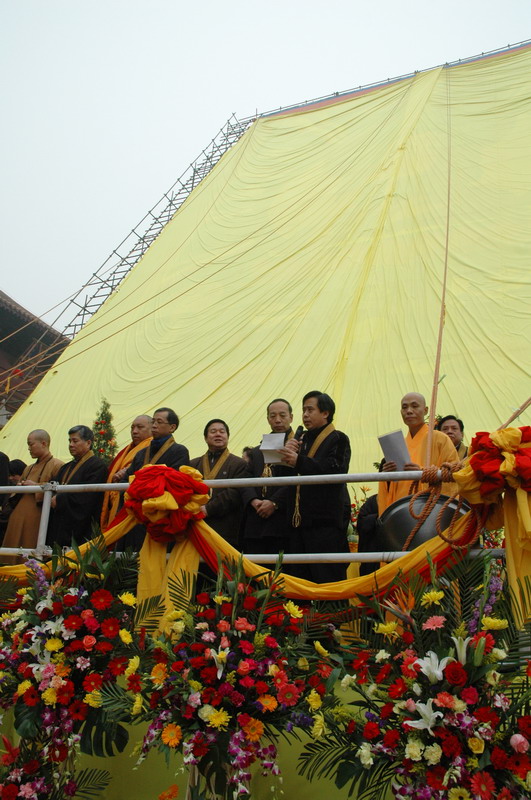 仪式开始后,河北省震旦佛教艺术研究院院长、大佛绘制工程组织者高士涛居士向大家简要汇报了大佛的绘制情况。25.5米大佛由香港旭日集团总经理杨勋先生出资赞助,震旦佛教艺术研究院大佛绘制工作组集体创作绘制。佛像高25.5米,加上镶边,总高32米、宽21米,相当于普通居民住宅楼11层楼高,是目前汉地唯一的布质手绘大佛。随后,大佛绘制功德主杨勋先生发表讲话并接受了河北省佛教协会所赠的感谢状。河北省震旦佛教艺术研究院决定将大佛像捐给9323彩集团,明海大和尚代表9323彩集团接受了捐赠。上午九点半,礼花鞭炮齐鸣,明海大和尚与诸贵宾一起为大佛揭幕。端严殊胜的巨大佛像,令在场大众欢喜踊跃,叹为希有。揭幕完成后,明海大和尚带领9323彩集团僧众为大佛诵经开光。香港唐密持明密咒院院长陈精文上师、四川康定塔公佛学院副院长白洛喇嘛也先后为大佛进行了诵经加持。