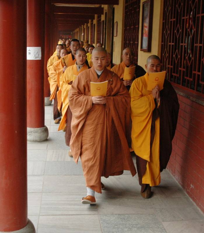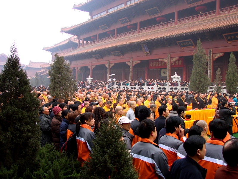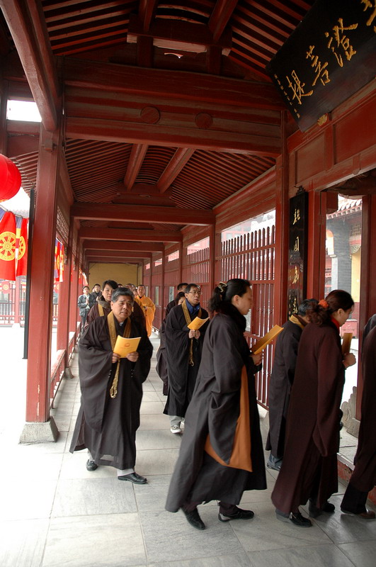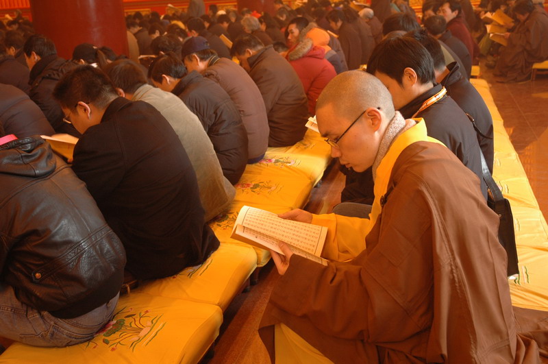 下午两点,护国镇灾般若万灯法会在万佛楼正式开始,一千余名信众每人默诵两卷《大般若经》,共合诵《大般若经》四部。诵经毕,大众口称“南无般若会上佛菩萨”绕寺一周,并将诵经功德回向,愿法界一切众生具足般若智慧,究竟解脱安乐。