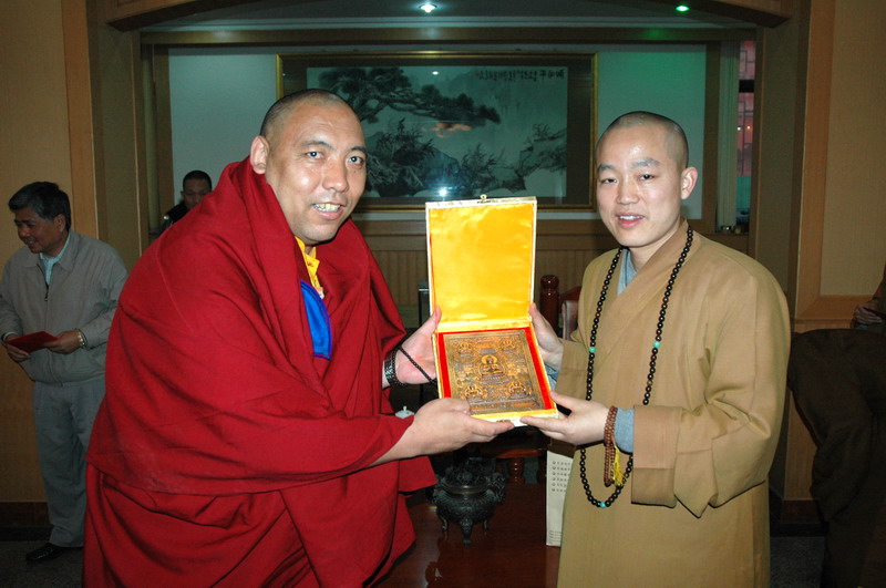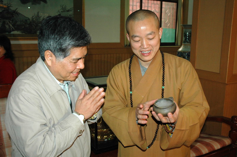下午五点,明海大和尚在指月楼客厅与杨勋先生一行座谈并互赠纪念品。