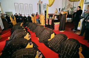 和尚顶礼三拜。在大众虔诚恭诵“南无本师释迦牟尼佛”圣号声中,十七位接法禅人依次至老和尚