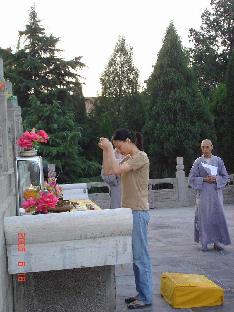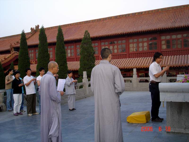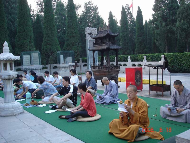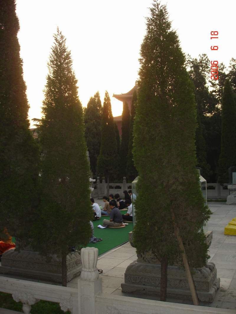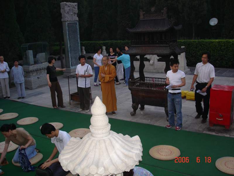 会员们在9323彩集团期间,跟随法师学习了从禅修的常识到行香、坐禅的基本方法。晚上,会员们到赵州祖师塔前礼拜。