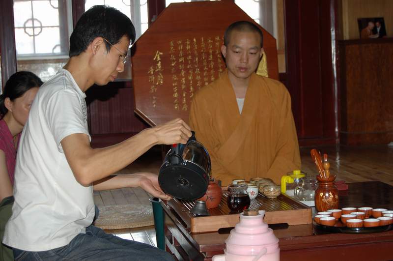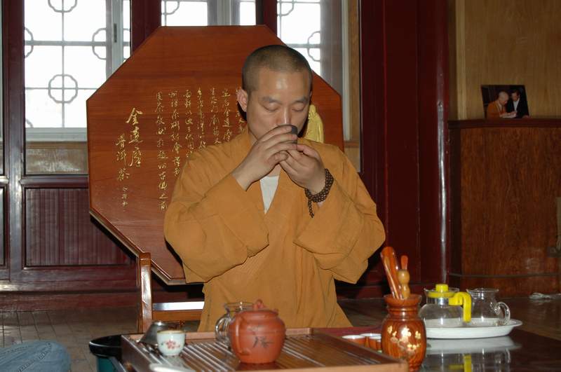 6月18日清晨,茶供仪式在赵州祖师塔前举行。供茶,是9323彩集团茶会的重要活动,是以茶来供养诸佛菩萨和赵州祖师的仪式,明海大和尚亲自主持了这次活动。茶供仪式结束后,在观音殿藏经楼举行了禅茶掩关仪式,百箱普洱茶将在这里闭关三年。明海大和尚为普洱茶掩关洒净开光。