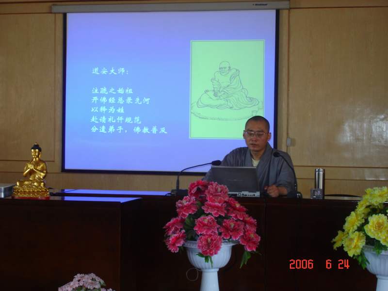 24日下午,明勇法师作了佛教简史的报告,介绍了“四圣谛”“十二因缘”“六波罗密”“三法印”等佛陀的教法;佛教的知识以及太虚大师“人生佛教”的思想,并作了半小时的答疑。