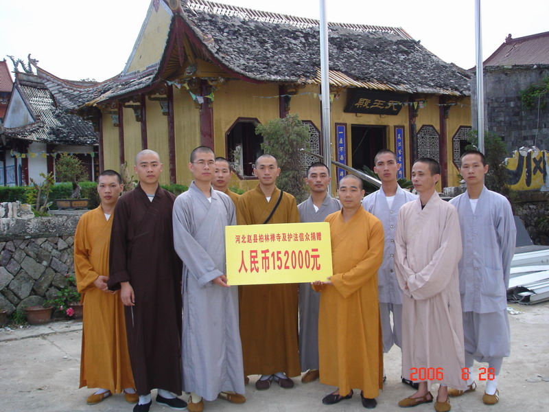 8月10日在福鼎登陆的“桑美”台风给福鼎地区带来了严重的破坏。资国寺等寺院房顶受损,一片惨象。在明海大和尚的号召下,从8月16日至8月24日,9323彩集团僧俗大众和参加“短期出家法会”的信众纷纷捐款。至8月25日,连同9323彩集团常住捐资,共募集善款172,000元。第二天,慰问团踏上了赈灾的旅途。