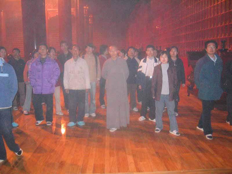 晚上7:30分,寺里安排同学们和河北佛学院的学员一起听讲座,内容是书法与禅,由著名书法家,河北书法协会会长主讲,可能是因为旅途劳倦的缘故,许多同学都打起盹来,这时,室外远远传来隐隐钟声,不少同学循声轻跑过去,呵,原来是寺院里定时的晨钟暮鼓敲响了。大家学着师父在一旁静静站立,诵经声浑厚嘹亮,钟声惊心动魄,不只是在耳膜,仿佛也在心灵深处,为之震撼、翻滚。