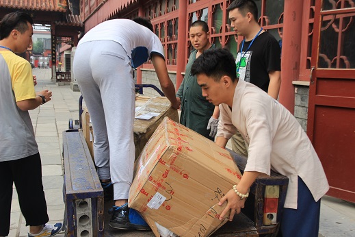 上午,十几位男义工顶着烈日,到流通处把几十箱营员的衣物和书籍搬到了祖师殿。尽管路程并不长,但是由于寺院内建筑物较多,需要绕几个弯,烈日之下他们大汗淋淋。心中怀揣着对所有营员负责的精神,大家干得格外起劲,很多义工都汗流浃背,却满心欢喜。