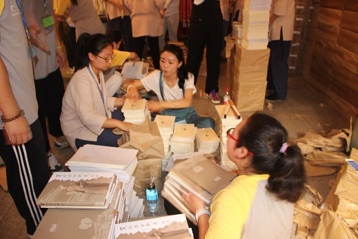 下午,义工们仍细致地做着准备工作:整理文殊阁、普贤阁的桌椅、坐垫;擦洗门前走廊;检查每一个细微的角落;对本届营员所需的日常用品进行整理--把应该发到营员手上的东西统一装入包内,主要包括六本书,一把扇子,一个茶杯。与往年不同的是,今年的包内多了一盒茶叶,让营员们得以品尝赵州茶的韵味。