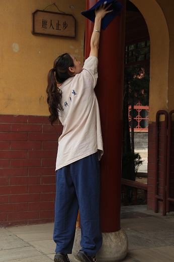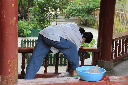 另外会贤楼和指月楼走廊的清洗工作也十分困难,有的红柱足有两米多高,需要登上桌子方能擦到顶部,指月楼的窗框不仅高而且框面纹路十分复杂,需要十分细致地擦拭。为了迎接营员们"回家",义工们克服种种困难,一一擦拭一新。